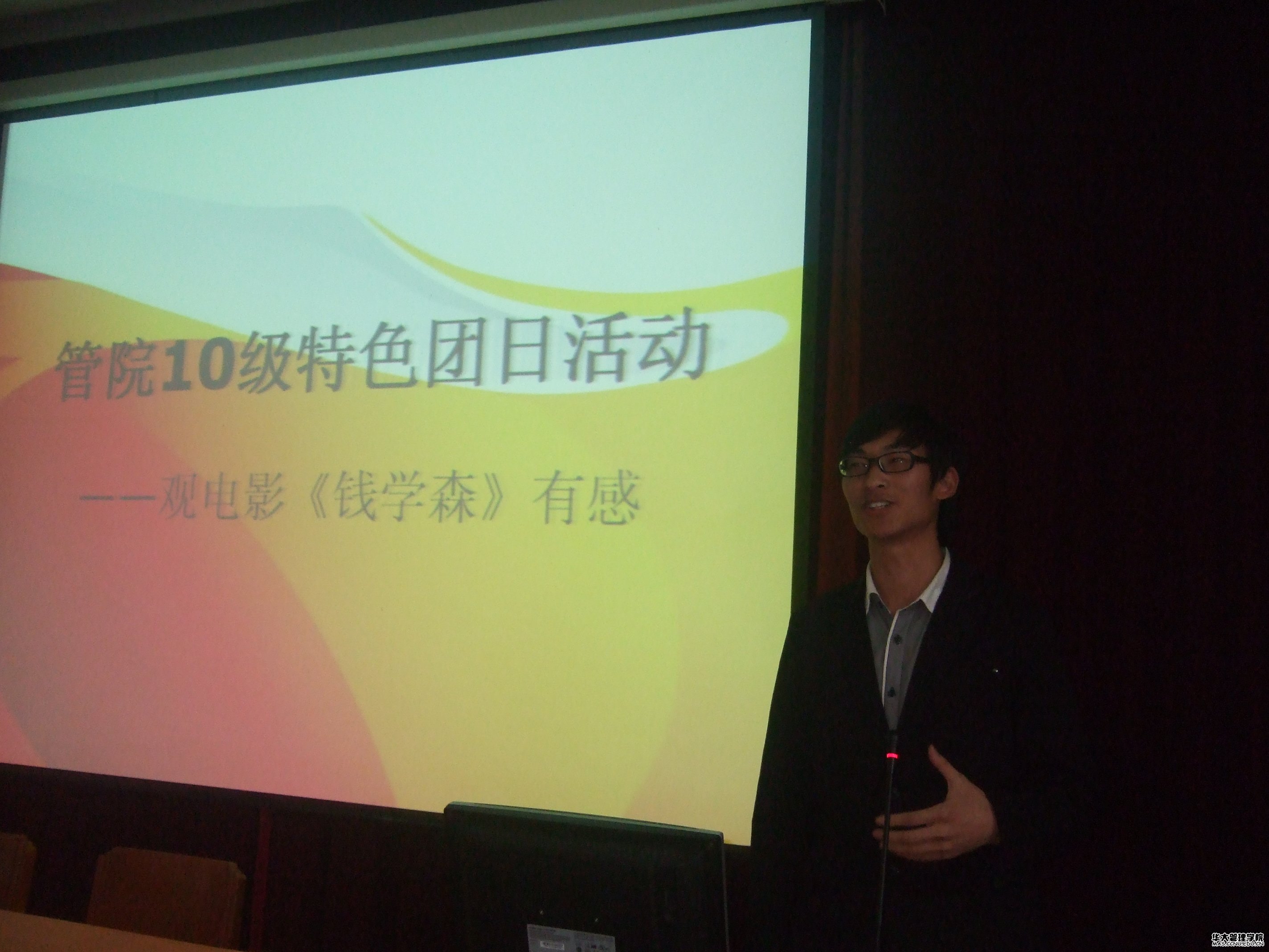 响应校党委宣传部、校学工部关于组织学生观看电影《钱学森》及开展主题教育活动的号召,我院组织学生集体观看了这部电影,取得了很好的效果,同学们反应也很热烈。为了进一步加深同学们对电影的理解、分享各自的观影感悟,2012年4月22日晚,10级团支部开展了
