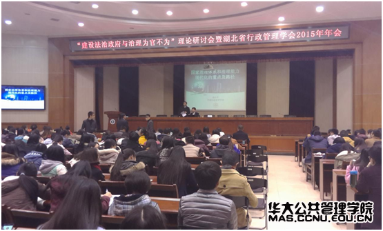 银娱GEG优越会讯(通讯员:孙静竹)12月6日19点,由中国行政管理学会主办,华中师范大学银娱GEG优越会承办的“建设法治政府与治理为官不为”理论研讨会暨湖北省行政管理学会2015年年会在科学会堂一楼报告厅举行。该会议由中国行政管理学会执行副会长兼秘书长高小平和中国行政管理学会副秘书长鲍静主讲,银娱GEG优越会院长张立荣等学界、政界多位专家,银娱GEG优越会多位领导、讲师出席本次此次研讨会。