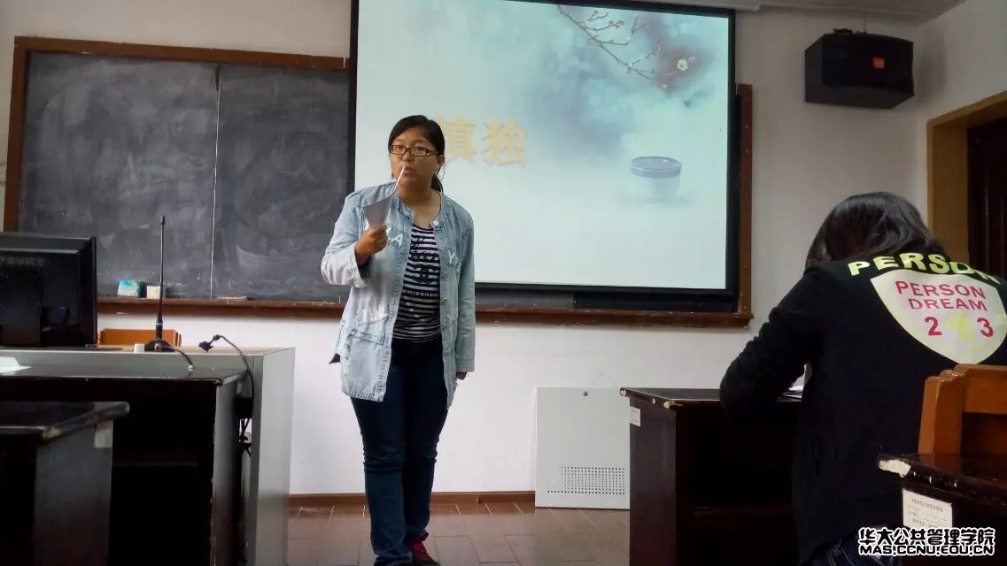 “莫见乎隐,莫显乎微,故君子慎其独也。” 来自大一的参赛选手孙静竹从习总书记的之江新语里挑选的这句话揭示了她的主题——“慎独”。从有无佛的历史故事引出慎独对个人修身养性的意义,再到如陆九渊、曾国藩、袁采等名人大家对慎独的理解,孙静竹同学随之发表了自己对于慎独的理解。并指出慎独对于当代青年学生的重大意义。“君子慎独,不欺暗室;慎于行为,独于自觉。”
