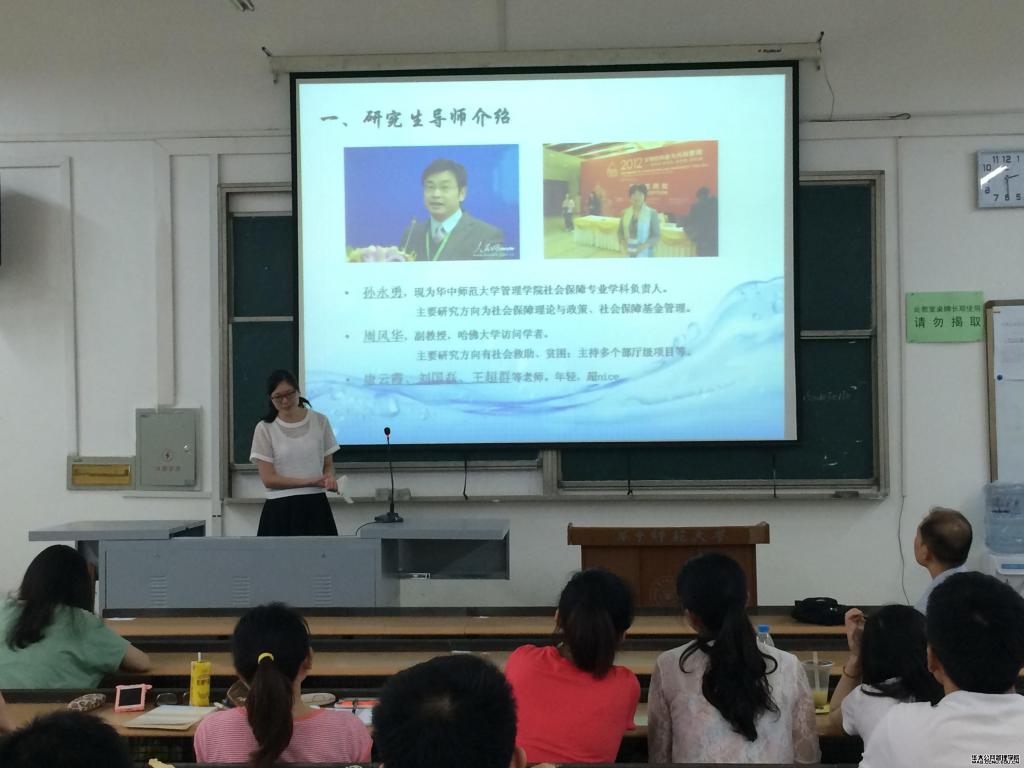 接下来是属于2013、2014级硕士研究生代表的经验分享与交流时间。第一位分享者是来2013级行政管理专业的尤盼同学,他颇有见地的将考研看作是一个身体和心理的双重考验过程,认为读研能不断提升自我素质和能力、积累知识并沉淀自己,并借自己的考研经验希冀同学们能持之以恒,在互帮互助中实现共同进步。农春榕同学则以一段导师介绍视频为先导,于有声处显现对导师刘筱红的浓浓情谊,在对学院师资力量、授课形式和教学环境大为赞赏时,她也大方分享了自己保研的心路历程,并真挚邀请本科生加入到温馨有爱的管院大家庭中来。来自教育经济与管理专业的2013级硕士李前壹则从专业、导师、就业状况与考研优势四方面,结合自身学习和生活历程,共享了一些心得体会,并建议诸位同学能尽早明确自己的目标,为未来奋斗方向做好准备。随后,2013级土地资源管理研究生王欣以大家熟悉的日常生活场景为例生动形象的解说了专业的研究方向和应用领域,她建议同学们在热门专业极为抢手的背景下不妨依据兴趣爱好转向部分“小而精”的专业。最后,社会保障专业的冯晓芳和涂青霞向同学们展示了研究生精彩纷呈的学习生活,特别是和导师互动交流的方式过程,涂青霞同学总结了考研中遇到的问题,建议有意向考研的学弟学妹要依据自身情况,理性选择专业和院校,步步为营的扎实前行。
