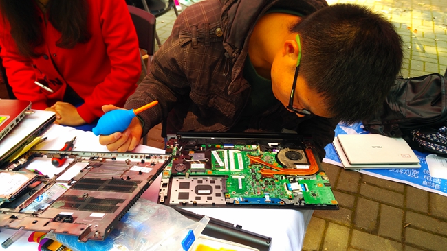 此次活动时间短,需要维修的电脑却很多,到了中午大家回去吃饭午睡,然而维修人员依旧在忙碌,他们忘记了饥饿,忘记了午睡,技术部长廖义林主要负责电脑清灰工作,清灰需要把电脑拆开,给各零部件清理,他一丝不苟,饭送到他的面前都一直没有时间吃,他说自己一忙起来就什么都忘记了,什么困啊,饥饿啊都想不起来,只想赶快完成工作,不耽误同学们使用电脑,自己苦点累点无所谓,大家开心就好。