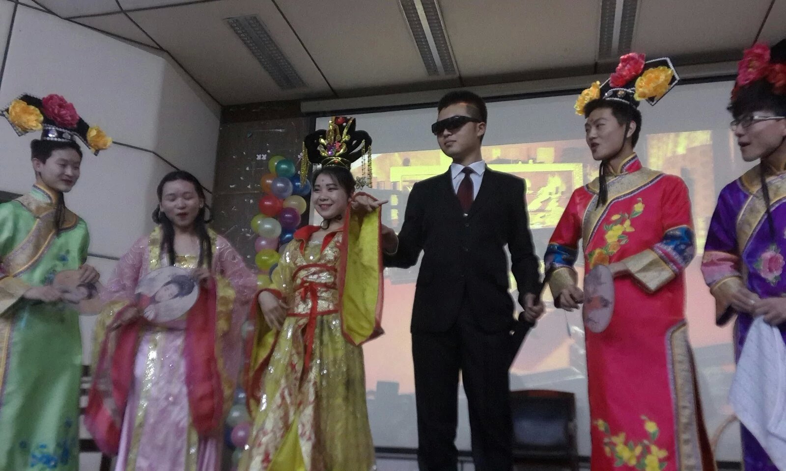 在随后的四组脑洞大开,灵活运用了当下火爆荧屏的电视剧——《甄嬛传》《龙门镖局》《琅琊榜》《三国演义》《红楼梦》《西游记》抢占同学们的眼球。男生反串的贵妃和丫鬟掐着兰花指,迈着小碎步,说着甄嬛体却手捧泡面,瞬间刺激场下的观众拿起手机录像拍照,记录他们“双性”的同窗。穿越后宫的现代保镖、头饰高过身高的皇后娘娘以及各宫娘娘齐聚一堂演绎了一出由雄楚大道断水引发的落马记。