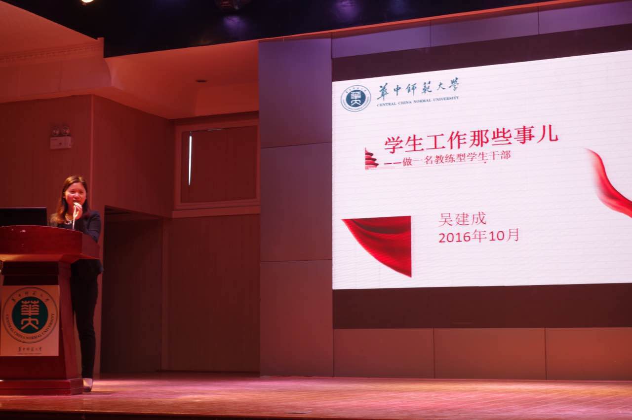 物理科学与技术学院党委副书记吴建成主持了培训的第一讲,她提出“我是谁”“身为学生干部是为了什么”“学生干部的标准是什么”“自己的缺陷有什么”“改善的方向在哪里”等五个问题,并在此基础上与参与培训的学员们进行互动。在她的悉心引导之下,学员们不仅深刻地发掘和理解了这五个问题,也互相熟悉了彼此。吴建成表达了自己对学员的期望:“有梦想,方能远航;坚持做,才有希望。人生没有等出来的精彩,只有干出来的辉煌!”