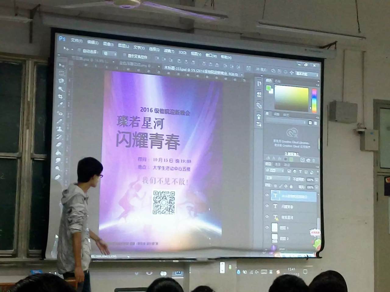 最后,吴任强同学带领同学们认识了PS的工作界面,他依次对标题栏、属性栏、菜单栏、图像编辑窗口、工具箱以及控制面板等主要工作界面做了介绍。同时吴任强同学提出“宣传工作,最重要的就是把信息传递给别人。所以背景和字体一定要有明显的区分。”