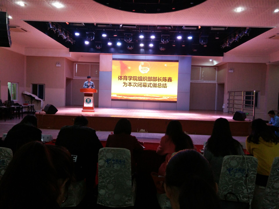 齐唱团歌之后,由体育学院团委组织部部长陈鑫发表讲话。他谈到了近期以来,参加培训的团干的积极表现,在工作开展中所遇到的问题及解决经验。强调学生干部们都是在实践中不断获得成长,熟练本职工作,学会协调一致,懂得团结共赢,将本职工作开展的如火如荼。这样才能从中感到幸福,希望各院的学生工作能蒸蒸日上,节节高升。