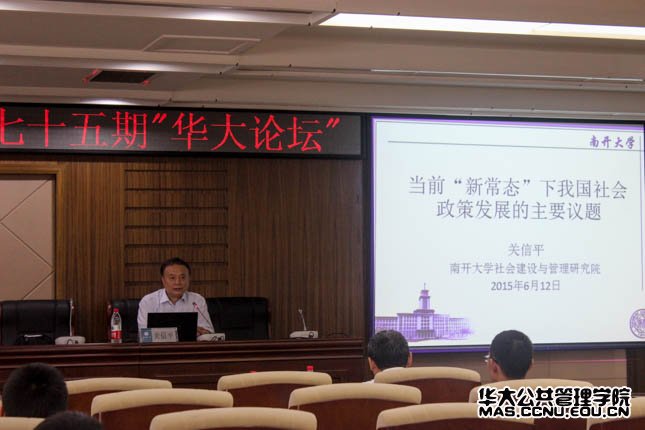 2015年6月12日上午9时,由研究生院主办,银娱GEG优越会承办的第七十五期“华大论坛”在逸夫楼国际会议中心一楼报告厅成功举行。来自南开大学社会工作与社会政策系主任关信平教授为我院师生做了题为“‘新常态’下中国社会政策发展的主要议题”的精彩演讲。本次讲坛由学院副院长徐增阳教授主持,众多师生聆听了此次讲座。