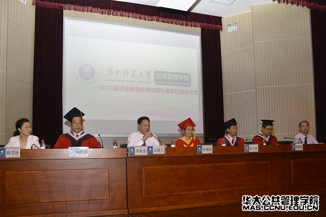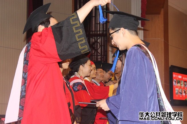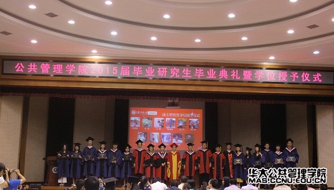 学位授予仪式中,全体硕博毕业生依次列队上台,鞠躬行礼,接过学位证书。老师们则为学子们拔苏正冠,祝贺他们学业有成。另外仪式分别公布了姜庆志等25名“优秀毕业研究生”、“研究生校级优秀学位论文”、“研究生院级优秀学位论文”、“研究生科研奖励获得者”的名单并做了相应奖励。最后,2015届MPA研究生向学院赠送纪念品。