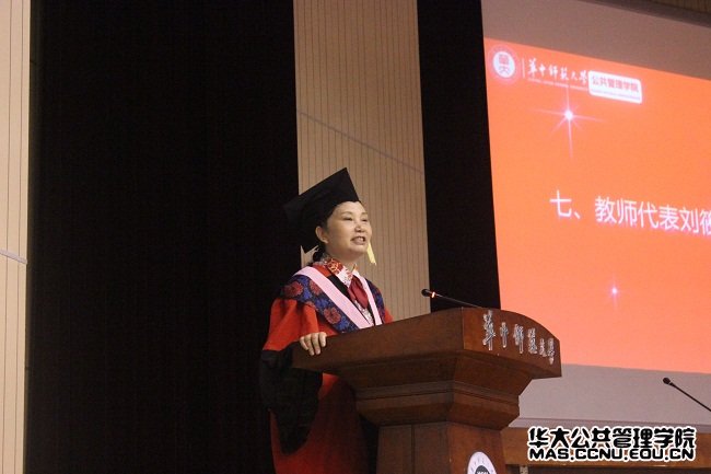 紧接着,院长张立荣教授发表讲话。他首先对所有毕业生取得的骄人成绩表达了祝福,殷切希望每一位毕业生有模有样的发展,有声有色的生活。愿大家能珍视师生情,珍视与公管院的情谊,关心母校的发展,支持母校的发展,帮助母校的发展。而作为教师代表的刘筱红教授,用三个意味深刻的案例向毕业生们送上三句深切寄语:初出茅庐,一定要用心做事;做一个博雅之人;做一个理解与同情,一个与人为善的好人。在这里,三年母校恩,三年师生情已然化作千千万万的祝福送给了桂子山的毕业生。
