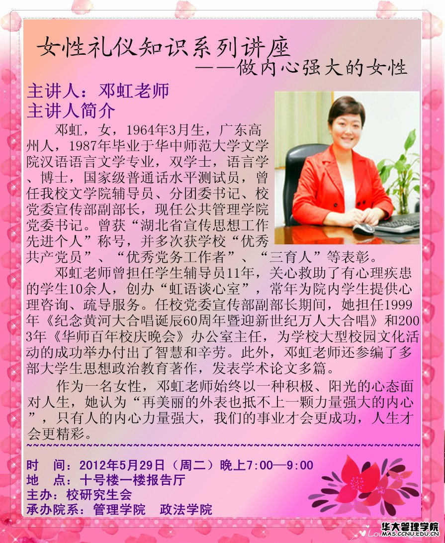 题 目:女性礼仪系列讲座-----做内心强大的女性 时 间:5月29日(周二)晚7点; 地 点:十号楼一楼报告厅; 主讲老师:邓虹书记;