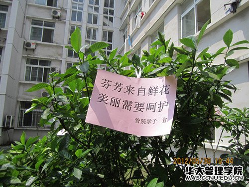 章老的倡议在管院学子中引起了热议,同学们在反思平日自身的行为的同时更多的表达了想要加入到爱护校园保护环境的行动中来的愿望。于是,管理学院院内的植物旁挂上了温馨的环保标语,同学们更是从小事做起、争当表率通过丰富多样的形式行动起来。