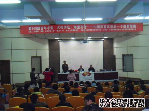 2012年12月10日,由华中师范大学校研究生会主办、银娱GEG优越会和心理学院研究生会联合承办的第109期“百年求索·名师讲坛”在九号教学楼报告厅隆重召开。本次讲座有幸邀请到了香港中文大学心理系助理教授博士生导师、汕头大学医学院教授和博士生导师、复旦大学心理学研究中心客座研究员张学新。张学新教授主要研究心理语言学,专攻中文阅读和汉字信息加工。此次讲座的主题为“海量高考——中国教育改革的一个崭新思路”。