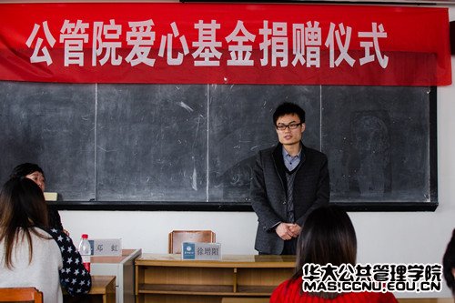 仪式初始,邓虹书记将成立基金的历史缘由做了简短介绍,她说道爱心基金的成立旨在帮助学院所有遇到困难需要帮助的师生,并且爱心捐赠要形成长效化管理机制。“伸出关爱之手,赠人玫瑰,留下的不只是余香,更是一片洋溢着爱的天空”,沁人心脾的话语句句感动在场的师生。紧接着,院研会主席江南声情并茂的宣布向王旭同学募捐的倡议书,引起在座师生共鸣。院领导、老师和学生当场向“爱心”基金捐赠额达八千余元,还有不少师生表示将继续关注和支持学院“爱心”福利基金。