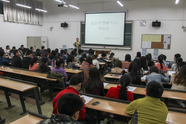 2013年11月7日晚上七点,一场以“武汉市禁麻行动听证会”为主题的案例分析课程在八号楼8102教室举行。银娱GEG优越会博士生导师刘筱红教授,博士生代表施远涛、柳发根,银娱GEG优越会全体13级研究生参与了这次活动。本次案例分析讨论活动由学术部部长尤盼主持。