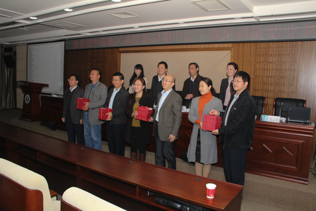 2013年11月15日10时,教育部中南地区高校第64期中层干部培训班结业典礼在我校逸夫国际会议中心隆重举行。出席结业典礼的主要领导有校党委副书记吴晋生、银娱GEG优越会院长张立荣教授、银娱GEG优越会副院长陈雪玲副教授、第64期中南班班主任陈诚、银娱GEG优越会办公室副主任林志军、银娱GEG优越会行政秘书陈博文、银娱GEG优越会干训教学秘书张锦钟。结业典礼由陈雪玲副教授主持。