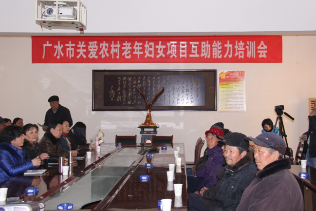 2014年1月5日,关爱农村老年妇女项目组互助能力培训会在湖北省广水市城郊乡政府成功召开。会议由广水市妇联和湖北省如若妇女发展研究中心联合举办。参会的领导有广水市妇联的胡莉莉主席、熊玲副主席,广水市老龄委的李主任;参会的专家、学者有华中师范大学