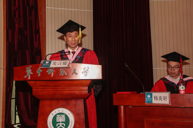 毕业典礼在雄壮的国歌声中拉开帷幕。本科毕业生张超、硕士毕业生代表汪超和博士毕业生代表谭学良相继上台演讲,通过他们对在桂子山求学时一幕幕酸甜苦辣的讲述,以及对母校恩师和同学们的真挚祝福所展现的那一颗颗赤子之心,换来了在场全体毕业生们一次又一次热烈的掌声。而作为教师代表上台演讲的戴胜利老师在祝贺全体毕业生完成现阶段学业的同时,寄语大家坚持学习、真诚做人和踏实做事。张立荣院长在演讲中首先表扬了毕业生们博学的精神和锲而不舍的努力。其后他对我院毕业生能够学能所成,学能致用在号称“最难就业季”的今年能够创造出良好的就业形势表达了由衷的称赞。在表达了对现场观礼嘉宾和工作人员的感谢后,张院长也对毕业生们作出了深深的期盼,希望大家珍惜师生情、同学情,怀揣赤子之心帮助母校和我院建设成国内一流的公共管理和人力资源培养基地。最后,他借用“五行”增语毕业生们:惜时如金,奋发如木,包容如水,激情如火和厚德如土,期望大家在追逐梦想的路途中大显身手。