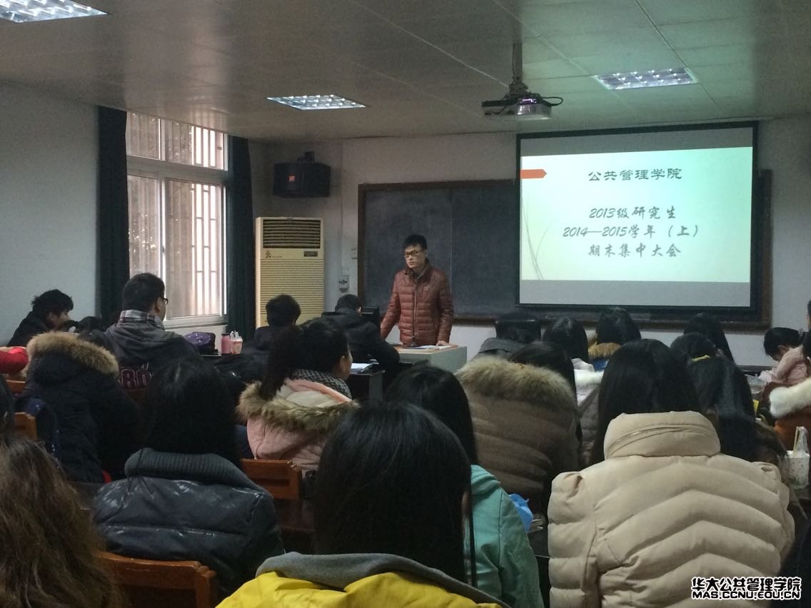 2015年1月27日,我院13级期末集中大会在319教室举行,研究生辅导员魏寅老师,研究生教学秘书欧阳峥老师,13级全体研究生参与了此次大会。此次大会由13级年级主席郑泱主持。