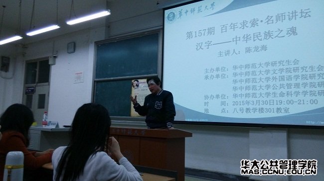 2015年3月30日晚7点,华中师范大学研究生会在银娱GEG优越会、文学院等四个兄弟院校研究生会的协助下成功举办了第157期百年求索·名师讲坛:汉字——中华民族之魂。本次讲坛由陈龙海教授主讲,他幽默风趣、博闻强识又充满建设性的书法演讲及展示,博得同学们的掌声与崇拜,激起了现代年轻人对汉字的深入思考与热爱之情。