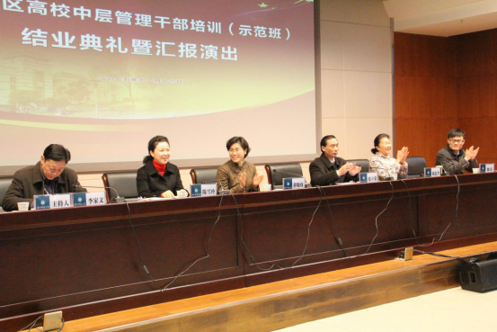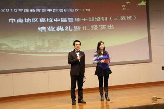 12月16日上午,银娱GEG优越会第一届“研究生干部能力提升工程系列活动”第三次活动在管理教育综合楼103开展。本次学习活动借助教育部中南地区高校中层管理干部培训班(示范班)的结业典礼暨汇报演出进行,到场领导嘉宾有华中师范大学党委副书记、干训中心主任黄晓玫,我院院长、干训中心常务副主任张立荣,我院副院长、干训中心副主任陈雪玲,华中师范大学原纪委副书记、中南示范班班主任刘忠平,我院研究生辅导员、中南示范班副班主任魏寅,活动由我院分党委书记李家文主持。