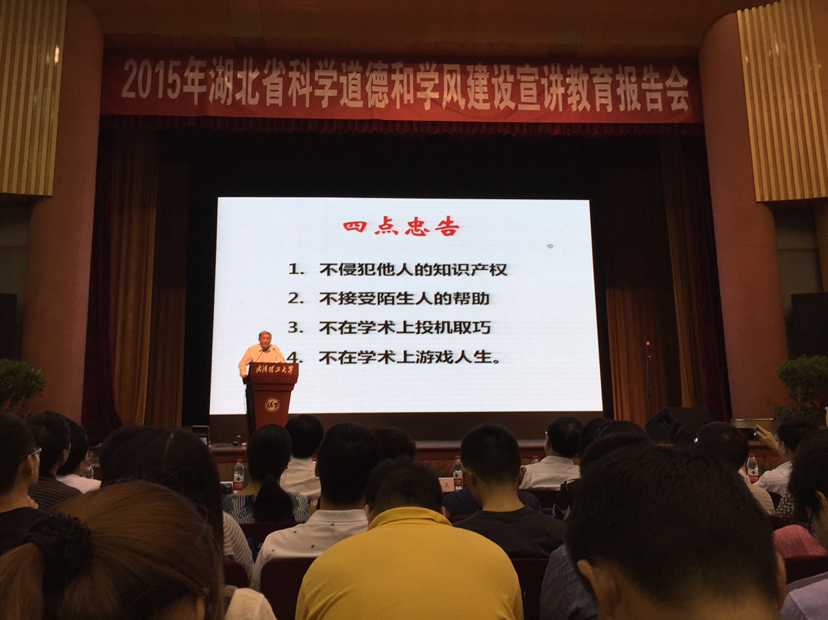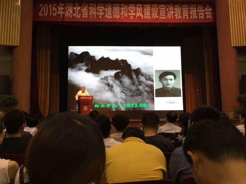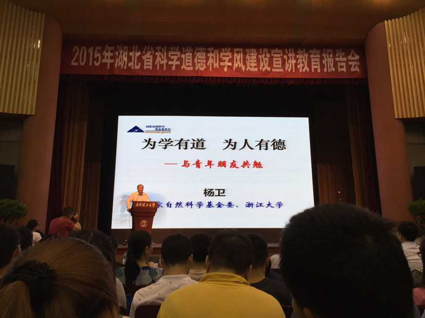感受学术道德,欣赏大师风采,9月28日下午2:30,我院30名研一学子代表我校,在研究生辅导员魏寅老师的组织和兼职辅导员农春榕老师的带队下,参加了在武汉理工大学西院大礼堂举行的2015年湖北科学道德和学风建设宣讲教育报告会。学校学院对此次活动给予了高度重视,同学们的参与热情也十分高涨。本次大会由杨卫院士(第十二届全国人大代表,国家自然科学基金委员会党组书记、主任,中国科学院院士、固体力学专家,教育部特聘教授,博士生导师)主讲,湖北各知名高校、科研机构均有参加。