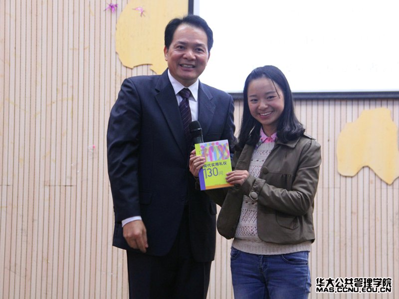 讲座过程中,赵邦教授不仅亲身示范,还与在场师生频频互动,现场气氛活跃,争相发言。之后 ,赵邦教授还赠予了互动同学自撰的礼仪专著,鼓励其学礼仪、知礼仪、行礼仪。