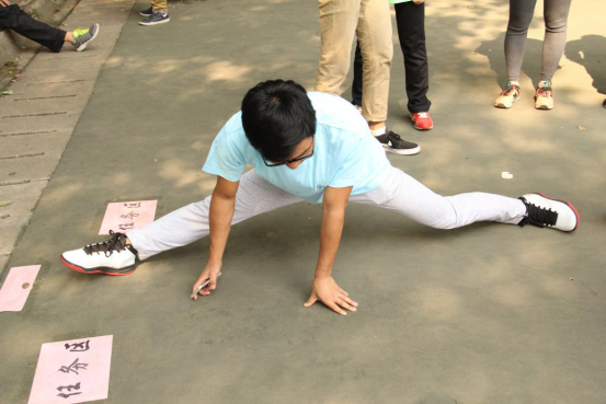 例如,东区小树林的“劈叉接龙”项目,现场气氛热烈非凡,选手们一个个奋力压腿,前后相连至起点线与终点线。喷泉广场的“干瞪眼”项目,需要队伍所有成员不准眨眼20秒,看起来很简单,但需要队员们一个都不能出错,眼睛小的的同学终于找到了优势项目。