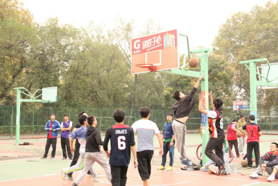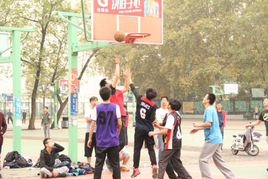 女子组之后是是男子组的比赛,研究生这边,研二的同学们首先上场。他们身高有优势明显,篮板、篮下使对方无处插手。本科的队员们打得十分认真,积极通过外围投篮赚取分数。