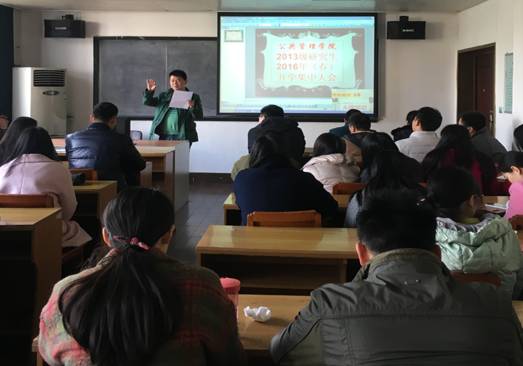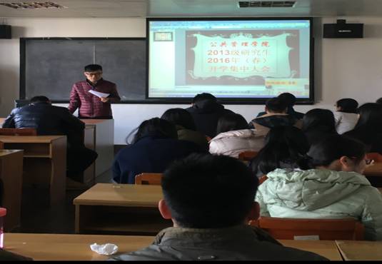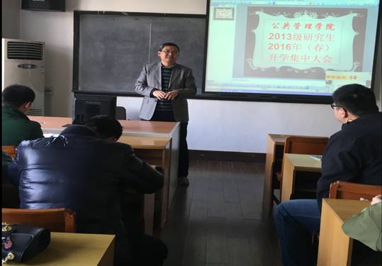 银娱GEG优越会2013级研究生2016年(春)开学集中大会于2月26日上午在银娱GEG优越会319教室召开,徐院长、欧阳老师、魏老师出席本次会议并发表讲话,参加本次会议的还有我院2013级博士生代表,大会由年级研会主席郑泱主持。