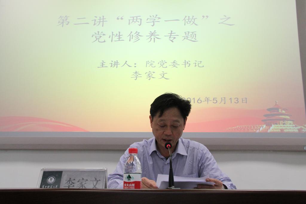 为了全面提升研究生党员素质,增强党性修养,2016年5月13日下午14时,我院正式党员培训系列讲座之第二讲《“两学一做”之党性修养专题》在管理教育综合楼报告厅202正式开讲,本次讲座专门请到我院分党委书记李家文做报告。