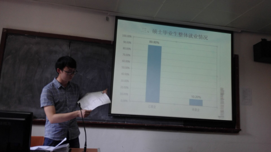 会议一开始由14届院研会主席童志阳就2013级毕业生的就业情况向大家做了介绍和说明,学长学姐的高就业率和高就业质量无疑给即将找工作的同学们注入了很大信心,此外,童志阳还向在场同学重点说明了未来的就业签约流程以及就业择业过程中需注意的问题。接下来,研究生辅导员魏寅老师作了重要讲话,他从战略和战术两个层面对本学期同学们的就业工作做了重要指导。在战略层面,他强调同学们一定要做好就业准备和就业规划,把握好就业关键节点和就业信息,调整就业心态,树立正确就业观念,同时注意就业安全。在战术层面,他指出同学们一定要注意就业过程中的细节,在简历制作和修改、笔试面试技巧技能等方面和同学们做了交流,最后魏老师也祝愿同学们能成功找到心仪的工作。