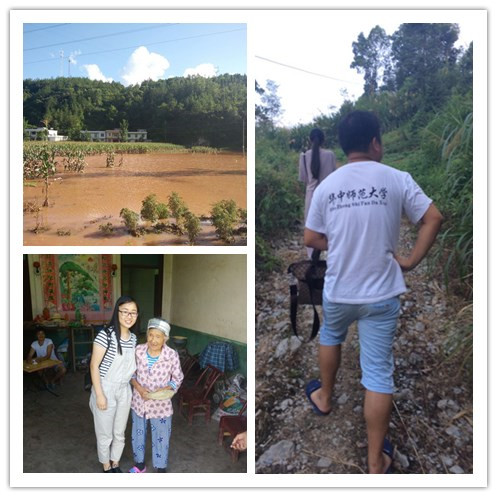 驻村之前,“小红军”秉承着“农村广阔天地大有可为”信念,卯足了“挥斥方遒”的干劲儿。可是当真正经历过下农村调研过程才深刻地感受到下乡调研的不容易。第一,天气恶劣。六月、七月洪水肆虐,黄冈、恩施等地遭遇特大暴雨,“小红军”刘淑姣和胡丹冒着暴雨成功撤离的当天下午,调研点大面积停电、停水,房屋、农田被淹,附近村庄的人及时撤离到高地。八月酷暑难耐,14级硕士马兰、张自荣等顶着烈日,忍受炙烤,行走在乡村小路探寻合适的受访者,抵达受访者家中已是大汗淋漓,此外还担心因为气温原因,双方不能够深入交流,晚上也因高温难以入眠。第二,农村居住环境艰苦,例如调研员成程遇到大黑蛇从房梁上掉下来的惊险一幕,女生在漆黑的夜晚忍受着狗叫的惊吓穿过草丛跑大老远去上厕所。但是无论“小红军”遇到了什么荆棘,都有着红军不怕远征难精神,最终都能克服重重困难,不抛弃、不放弃地完成调研。