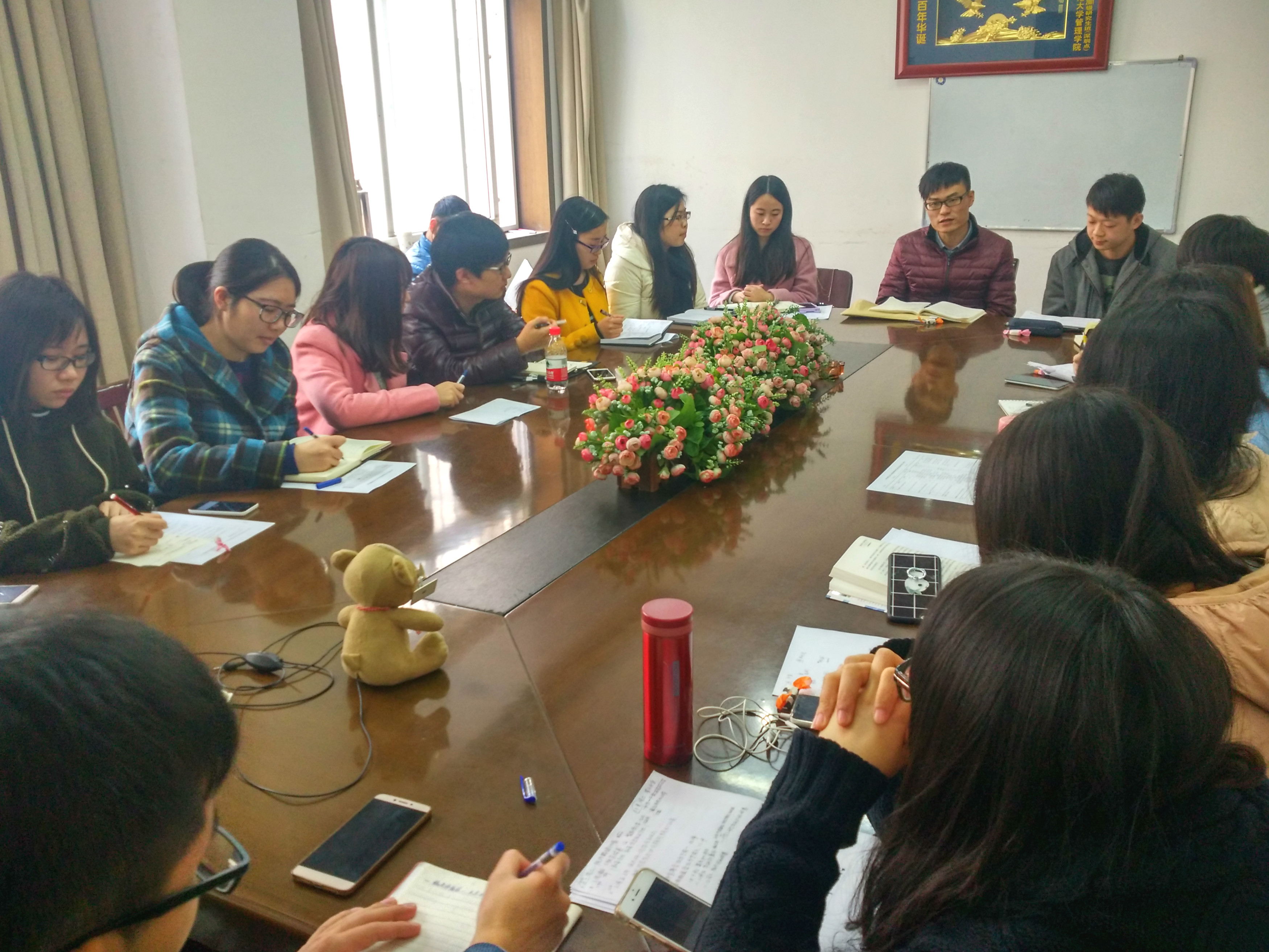 会议开始,各部门负责人首先按例总结了本部门在过去两周中举行的各项活动。临近学期末,各部本学期的工作都已接近尾声,研会全体成员接下来的工作重点将放在2017年元旦晚会和“冬至包饺子”活动中。大家就“冬至包饺子”活动的时间、地点、菜品选择和付款方式等问题进行讨论。随后,赵云飞主席从前期准备阶段、晚会当天和晚会结束后三个部分,对元旦晚会各部门的具体任务进行了详细分工。魏老师也提出要尽快确定晚会的节目编排。接着,赵主席对参观市民之家的活动作出了具体安排。