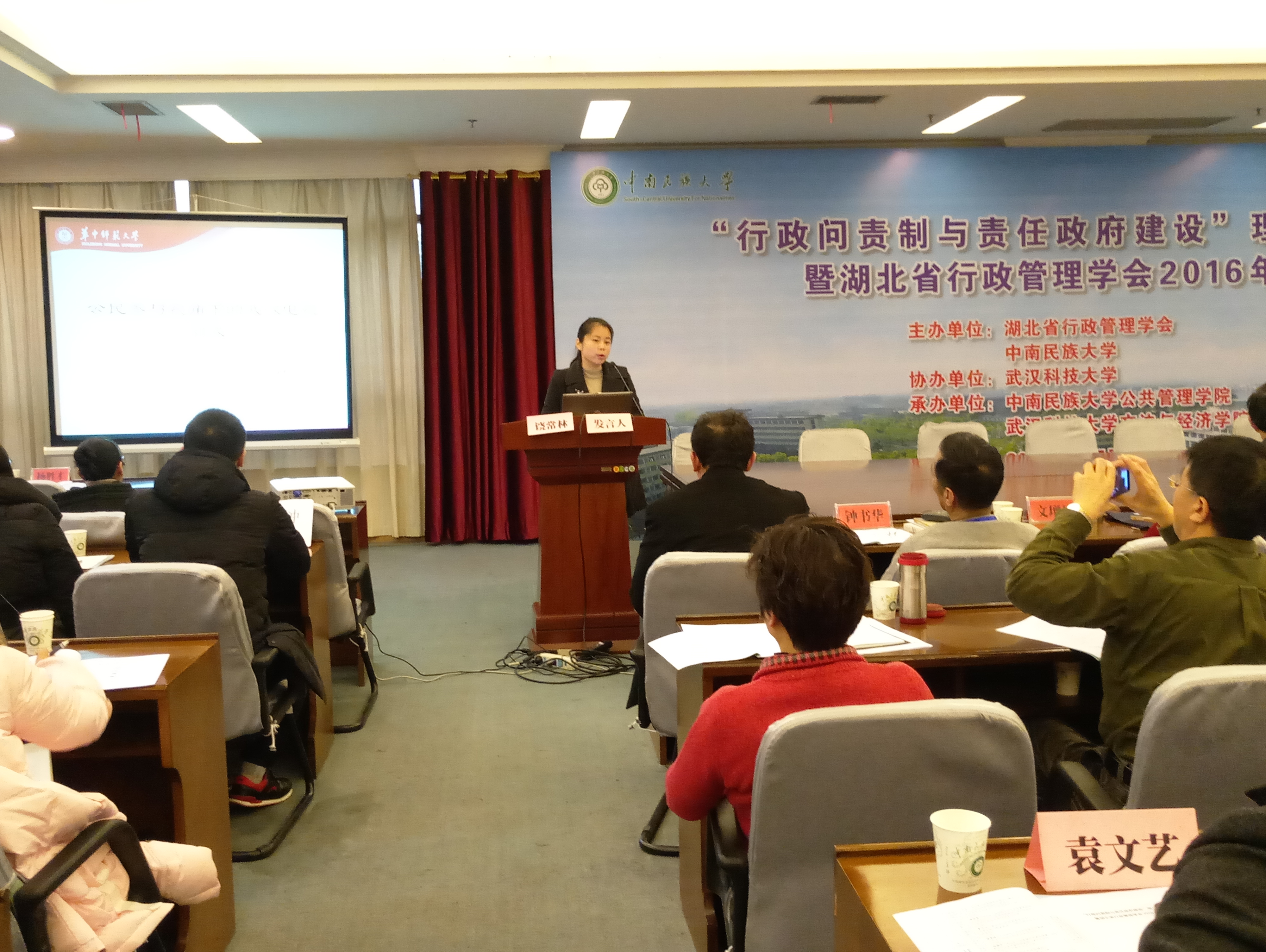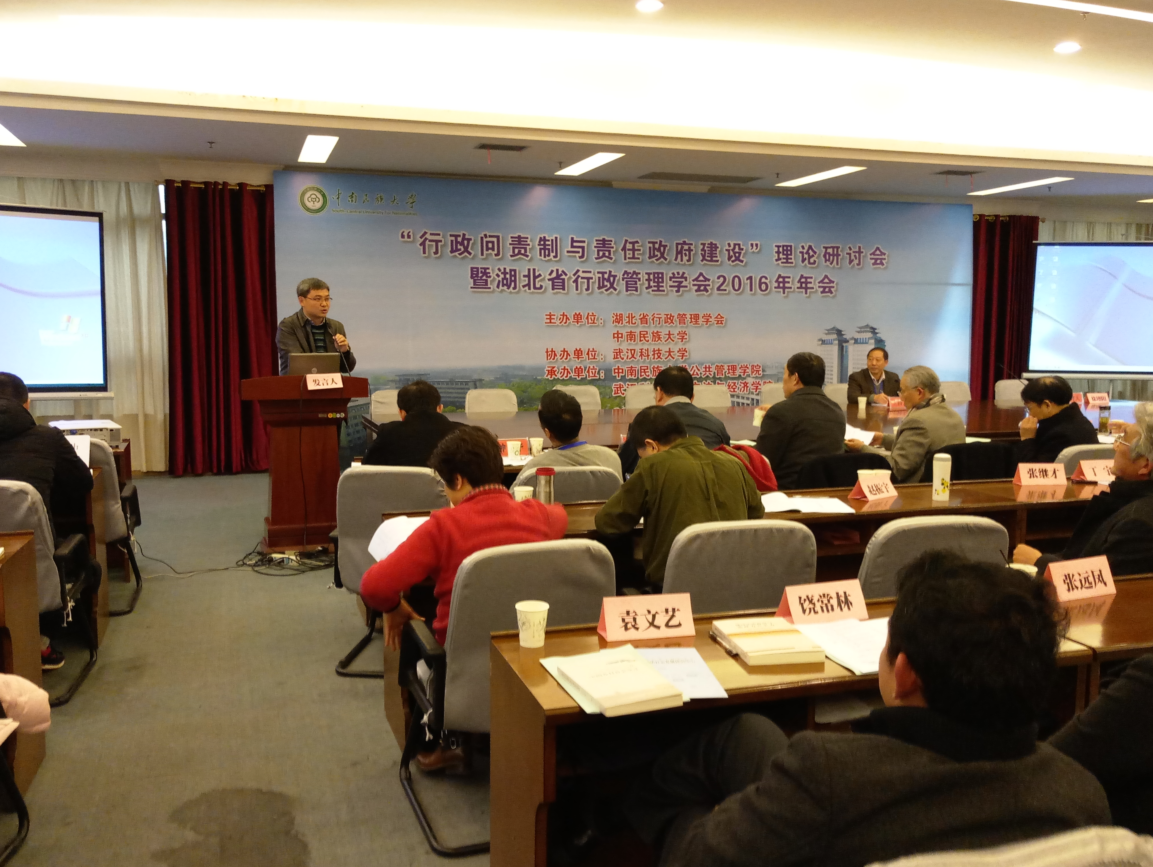1月7日上午,“行政问责制与责任政府建设”理论研讨会暨湖北省行政管理学会2016年年会在中南民族大学隆重举行,学界、政界诸多专家学者齐聚一堂,我院徐增阳教授和饶常林副教授分别作为点评专家和报告人出席会议,冷向明副教授亦参加了此次会议,部分硕士生到场旁听。