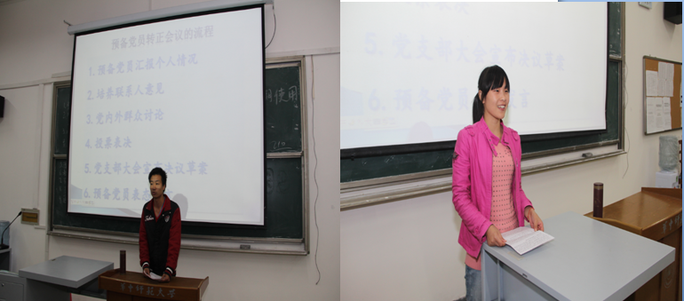 首先会议讨论了预备党员黄胜胜、葛慧珍两位同志的转正事宜,各个预备党员分别发言之后,由其两位介绍人汇报本人的基本情况,最后由各党员投票表决,一致同意两位预备党员转正。其次会议传达了党员发展的精神,以公正的态度和公开公平的方式来推选2014年新的党员发展计划。党支部表达了对组织新成员的加入表示了热烈的祝贺,对与会的学生党员表达了谢意。