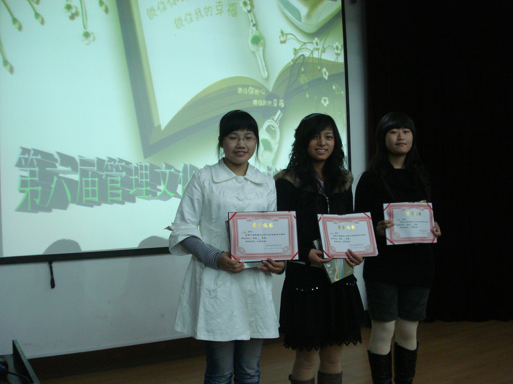 管理学院党委书记邓虹、党委副书记马新华、分团委书记庄甲鹏以及王艳艳老师应邀出席了活动,并担任了此次比赛的评委。活动由秘书长徐博主持,十位从初赛中脱颖而出的07、08级同学参加了该比赛。选手们或慷慨激昂地阐述着自己的见解,或声情并茂地抒发着从书中获得的启发,再配上制作精美的PPT,真是一场不容错过的视听盛宴。活动中还穿插有趣味知识问答,现场的气氛庄重而又不失活跃。经过激烈的角逐,石蕾等六位同学分别荣获了一、二、三等奖,08级的张磊同学获得了“最具舞台表现力奖”。