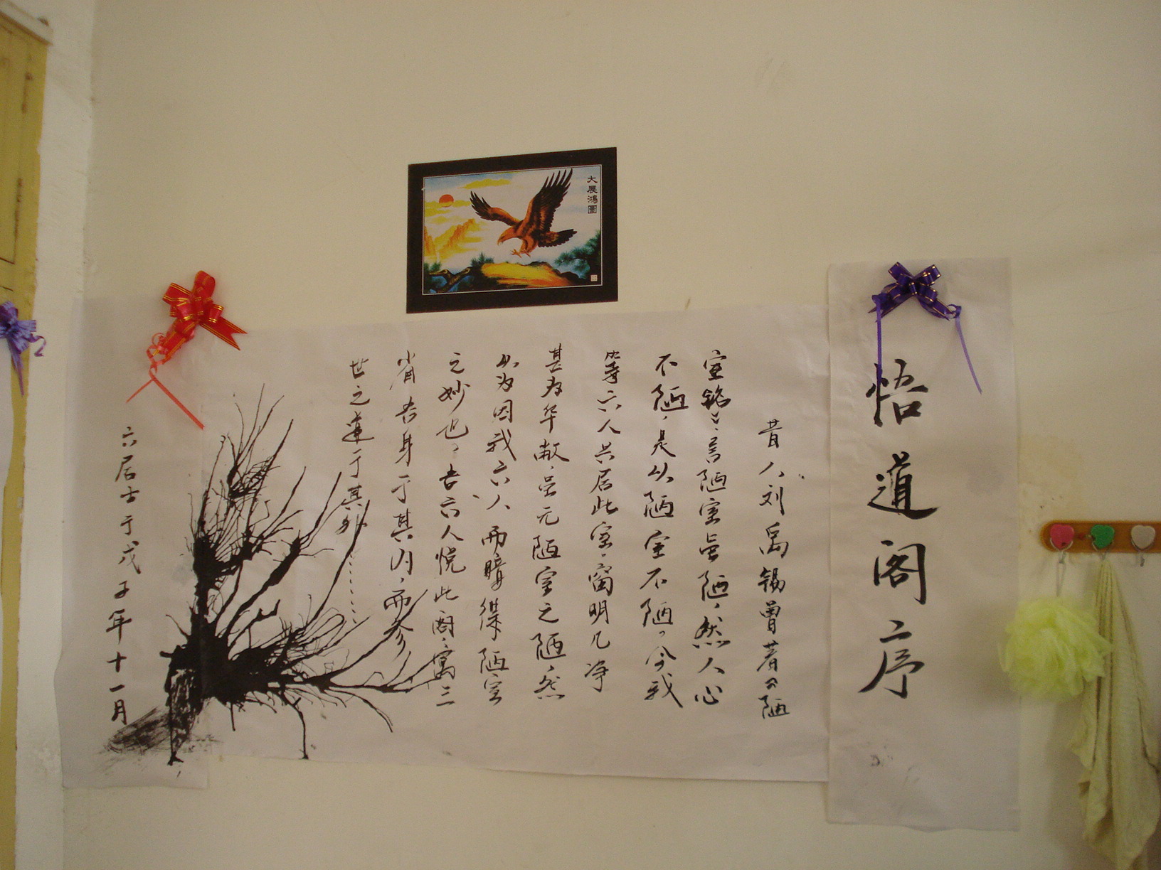 同学们灵活运用自己所长,写字、画画样样不少。本来苍白的天花板悬上了彩带、柳条、气球。本来斑驳的墙壁贴上了各色花样的壁纸。有的寝室设计了漂亮的留言板,上面有大家的合影,有同学们自己的心情、感悟;有的寝室设计了废旧电池回收箱,体现了强烈的环保意识;还有许多寝室不约而同的在墙上在床头贴上自己写的人生格言、座右铭,时刻激励自己奋发向上……