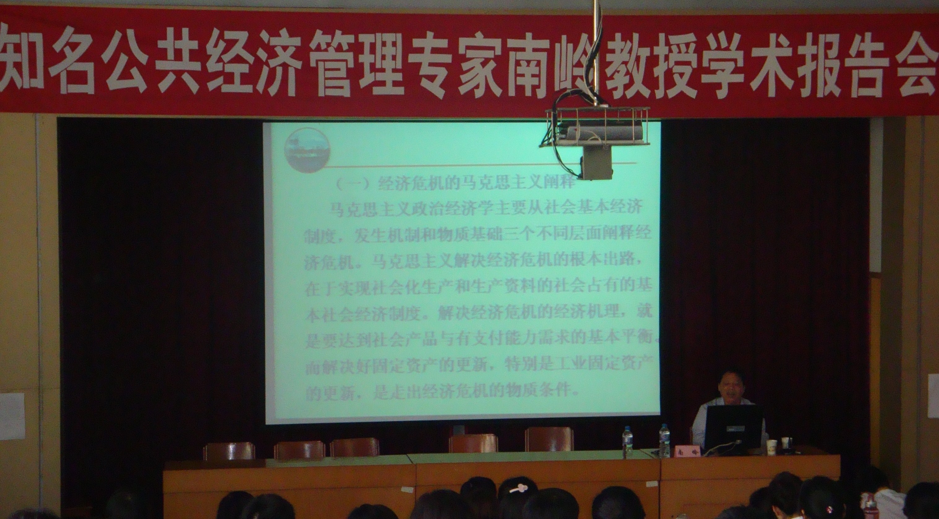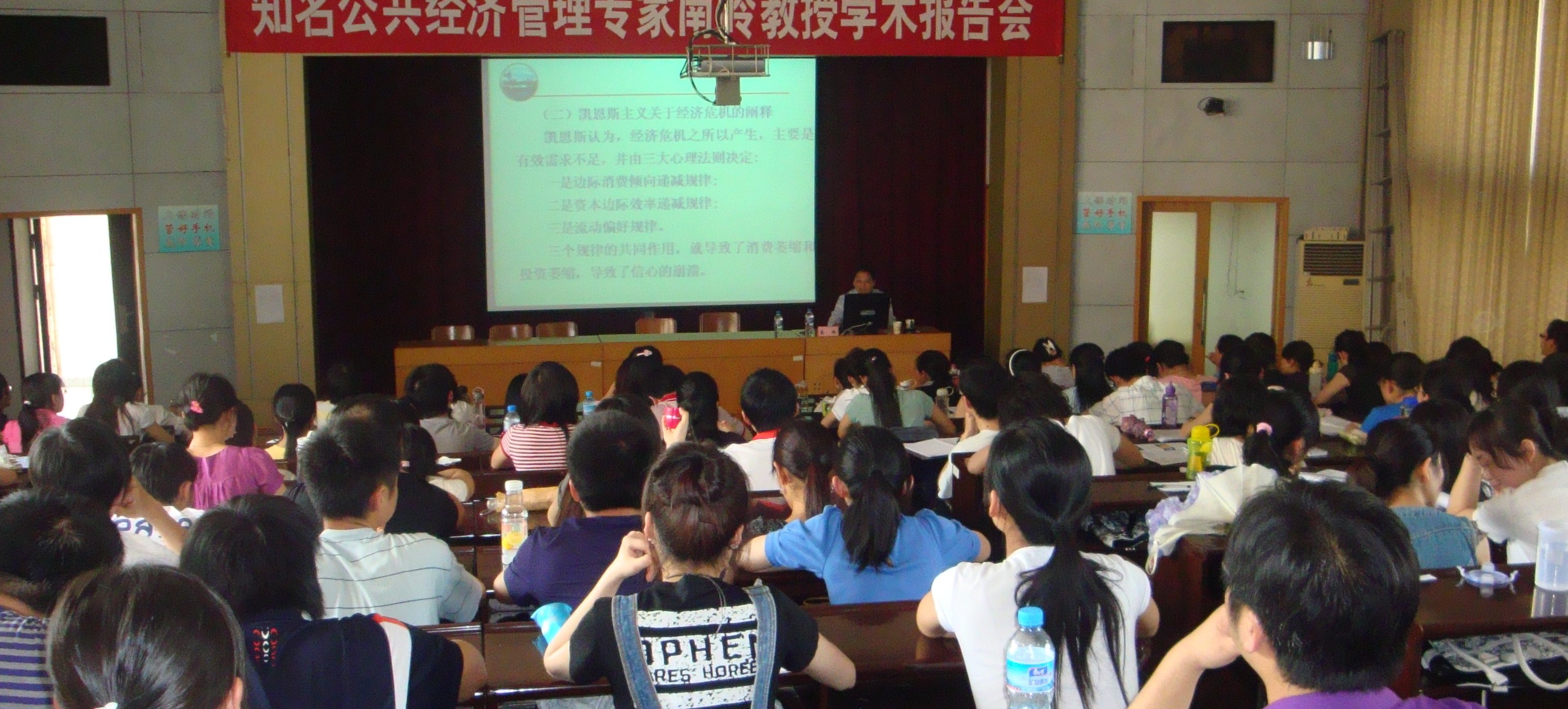 会议开始,南教授就当前的经济形势展开分析,介绍了相关的经济理论,并指出:“资本主义经济危机产生的根本原因是有效需求的不足。”针对这一问题,南教授表示:“在市场经济盛行的当今,要想恢复经济重振信心,政府的干预是十分必要的。国家必须采取扩张性的财政政策并以创新来促进经济结构的改变。”随后,南岭教授就“经济危机是如何波及中国”这一点进行分析,强调了中国经济体制与西方经济体制的差异以及中国应如何应对全球经济危机。最后,张院长发表讲话,表达了对南教授的感谢以及对广大同学的期望。
