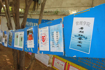 (管理学院讯 通讯员 万金成 朱琳)10月10日,管理学院青年志愿者协会在老团委门前对管理学院暑期社会实践活动成果进行了展出。据悉,该成果分两个板块,共七个项目,包括三个团体实践———“三院联合走进大悟”,“汉阳社区志愿服务”,“江西崇义之村的社会调查”;四个个人优秀实践———07级王波、08级张开璇同学之企业人事部实习;08级刘栩源同学之广播电视台实习记者;08级姜晟同学之大学生交流文化节。这些图片一经展示,引起了热烈反响。路过观看的同学纷纷表示管院学生实践心得对他们影响很大。