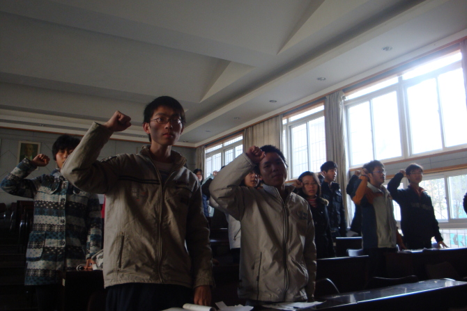 (管理学院 通讯员 万金成)2009年12月5日, 管理学院青年志愿者协会在管理学院101教室举行了“管理学院青年志愿者协会新进志愿者宣誓典礼暨第一次培训”。全体2009级志愿者到会。协会会长万金成,副会长赵欢,以及08级优秀的志愿者代表白洋均参加了此次会议。