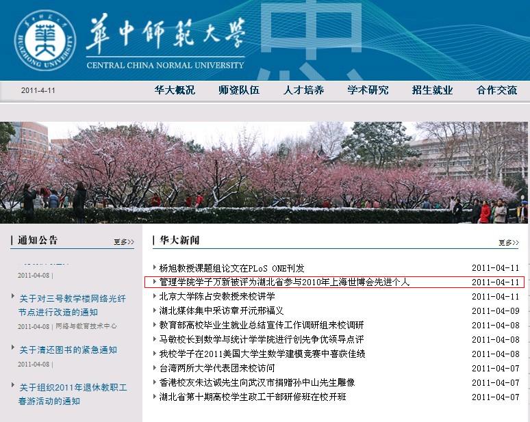 4月11日,学校主页《华大新闻》给予了报道:管理学院学子万新被评为湖北省参与2010年上海世博会先进个人(