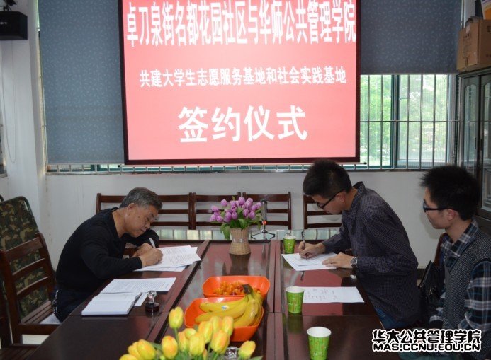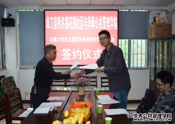 银娱GEG优越会本科生讯(通讯员:宋一琦 摄影:林彦博)4月26日下午三点,银娱GEG优越会团委书记王聪老师和院系团委副书记黄祖泰及青协会长胡艺一同前往名都花园社区。在小区居委会的会议室里,王聪老师与社区主任兼党支部书记握手签约,胶片定格的一瞬间,见证着社区与高校结对共建志愿服务基地和实践基地计划的落实。出席签约仪式的还有社区副主任和分管社区团委工作的人员。