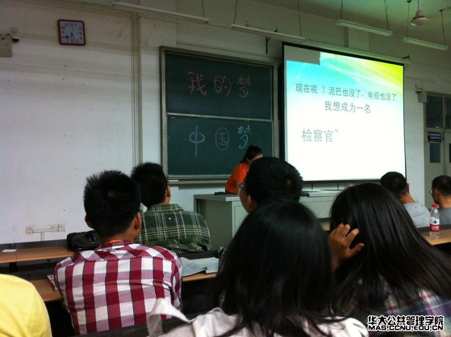在轻松愉快的氛围中,12级团支书闫骏同学作为主持人宣布活动开始。在观看完《中国梦之微梦想》视频后,王聪老师与大家分享了他所理解的中国梦:每个人都有梦想,每一个公管人的梦组合在一起就是公管梦,每一个学院的梦组合在一起就是华师梦,每一个当代大学生的梦组合在一起就是青年梦,中国梦是由一个个中国人的梦连接在一起的,只要每个人都为了梦想努力拼搏,为个人为集体,就能更好地实现我们的中国梦。