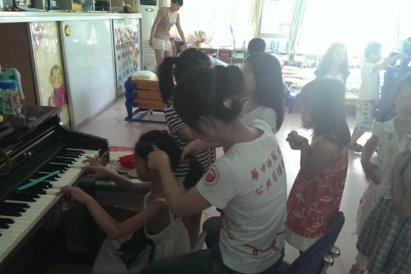 7月10日上午九时,第一支小分队到达了社区幼儿园,与园长进行了交谈,随后被逐一分配至不同年级的班级中。经过任职教师的简短培训,志愿者们很快投入了工作中。他们有的发挥特长,如弹奏钢琴,带领小朋友们唱歌,或者教授少儿舞蹈,深受孩子们的喜爱;有的客串起教师教授孩子们简单的英语单词并开展与之相关的益智游戏,很快与孩子们建立了友好的关系;有的陪孩子们做手工。幼儿园的老师对此评价,华师的志愿者果然很不错,这些小事就向我们展现了一个志愿者的耐心与责任心。两个小时的志愿服务活动结束时,志愿者们与孩子们建立了亲密友好的关系,圆满完成了志愿服务。