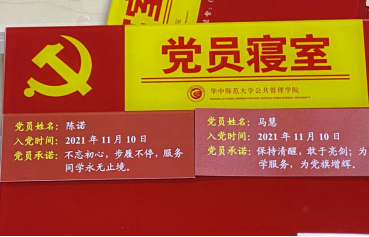 华大公管讯(通讯员 玉梦涵)12月16日晚,华中师范大学银娱GEG优越会本科党支部举办“党员寝室挂牌”活动,要求学生党员“亮明身份”,自觉接受同学监督,体现党员在学生寝室中的先锋模范作用。本次活动,支部收集整理了全体党员信息,联系制作挂牌模板。支部成员集中领取党员寝室牌与党员信息卡后,将党员寝室牌悬挂在寝室房门统一位置,为学院寝室氛围带来了一抹抹红色力量。