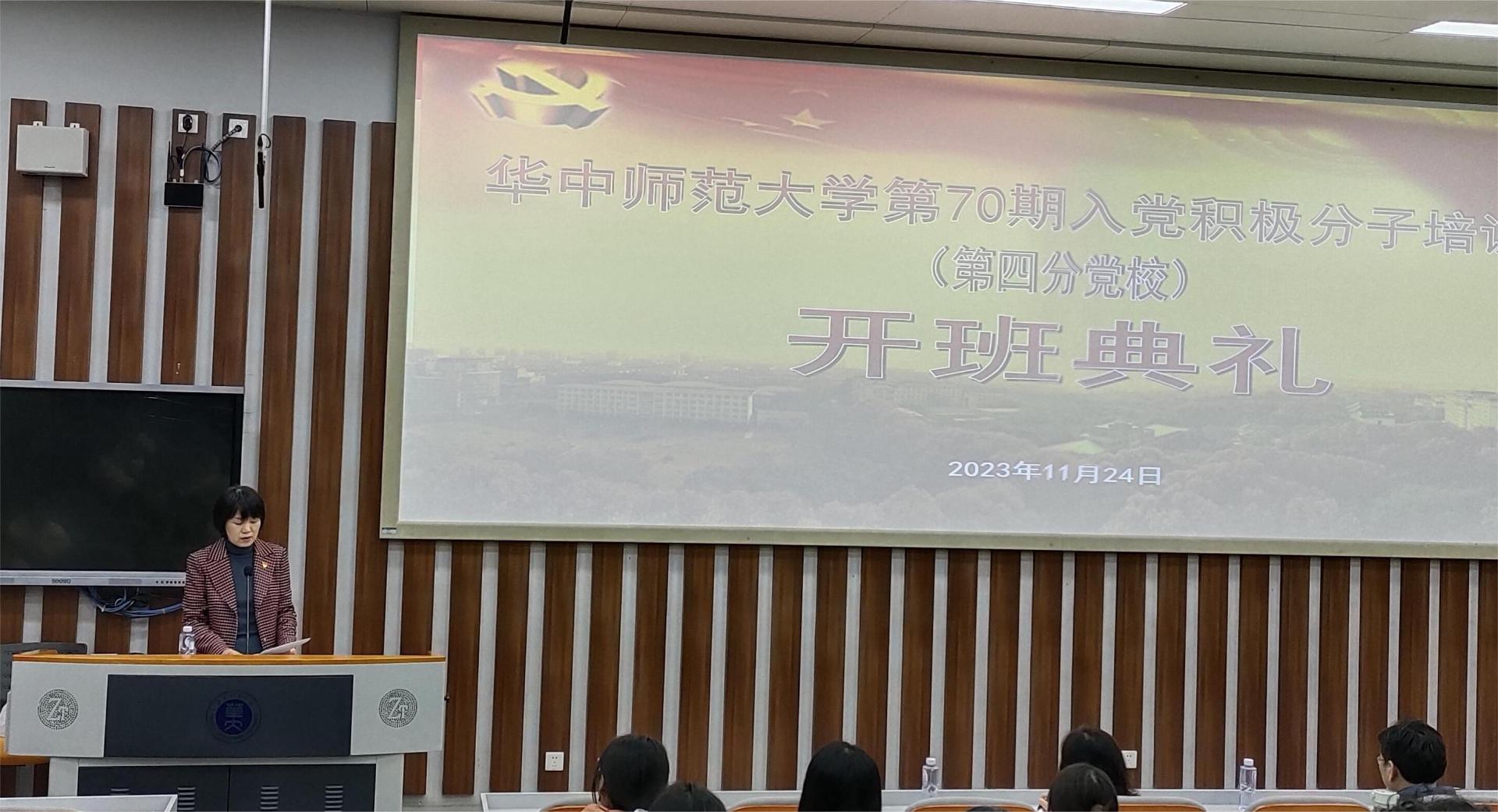 华大公管讯(通讯员姜慧敏)2023年11月24日,华中师范大学第70期学生入党积极分子集中培训班(第四分党校)开班典礼在南湖综合楼N301顺利举行。银娱GEG优越会正处职组织员杨帆、人工智能教育学部党委副书记邓飞、银娱GEG优越会党务干事林志军老师、人工智能教育学部校聘组织员杨先顺老师,以及银娱GEG优越会和人工智能教育学部共138名学生入党积极分子参加此次开班典礼。开班典礼由银娱GEG优越会党务干事林志军老师主持。