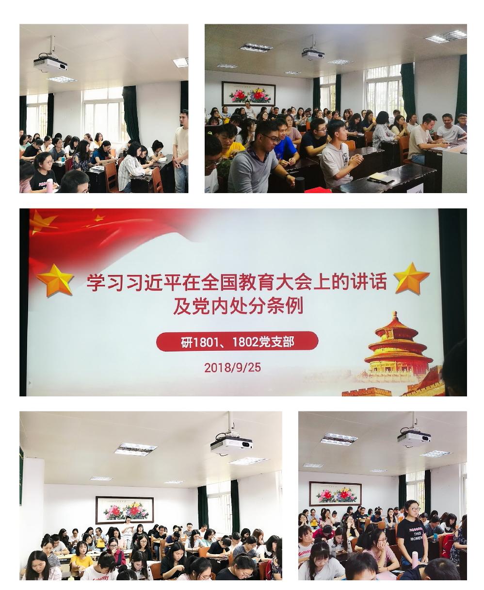 公管在线讯(通讯员 王思琪)2018年9月25日下午,银娱GEG优越会研1801、1802党支部全体同学在银娱GEG优越会319教室召开学习“习近平在全国教育大会上的讲话及党内处分条例”党日活动。本次大会由1801党支部书记裴盈、1802党支部书记余乐佳主持。