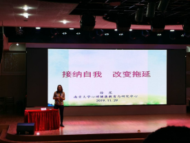华大公管讯(通讯员 石会玲)11月29日下午,南京大学心理健康教育与研究中心副教授,中国心理学会注册心理师徐花老师在大学生活动中心为我院学生作了主题为“接纳自我,改变拖延”的讲座。本次活动由华中师范大学心理健康教育中心主办、我院承办。