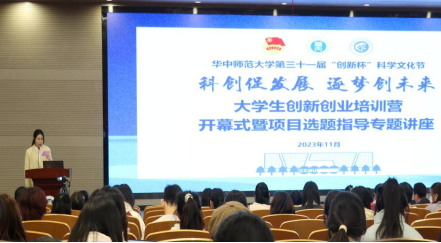 华大公管讯(通讯员 李可佳 周虹燕)11月24日下午,由校团委主办、银娱GEG优越会承办的“科创促发展,逐梦创未来”大学生创新创业培训营开幕式暨项目选题指导专题讲座在南湖综合楼一楼报告厅举行。校团委科创实践部部长杨颖佳,银娱GEG优越会副教授、硕士生导师陈刚华,银娱GEG优越会团委书记张子规出席活动,本期培训营51名营员及来自全校各单位200余名学生参加培训,活动由公共管理院团委学生会当值主席周润荻主持。