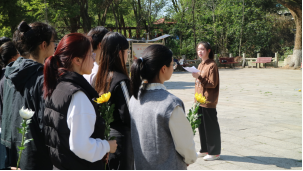 活动开始,全体同学齐唱团歌。烈士纪念碑前,同学们排成整齐的队伍,手持鲜花肃立,全场气氛庄重而肃穆,2303团支部团支书林诺希组织同学们向革命烈士碑敬礼,向英烈致以最崇高的敬意。