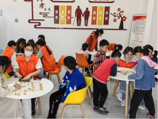上午十点,大部分小朋友完成了自己的作业,志愿者带领完成作业的小朋友前往一楼活动室休息,鼓励并陪伴小朋友们开展下棋等活动。同时,志愿者时刻关注安全问题,在小朋友们嬉戏玩耍时以“一对一”或“一对二”的形式陪同跟随,提醒他们远离电器插口和尖锐物品等。在与志愿者的良性互动中,小朋友们也逐渐从害羞变得放松,积极参与到各项活动中。